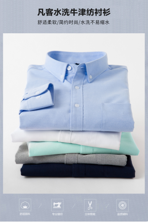 凡客诚品的牛津纺衬衫,传承了牛津纺面料的经典特质。牛津纺面料由白色与不同颜色的色纱编织而成,色泽柔和、文静,选用的年轻时尚色系,简约大方。它不仅透气性能良好,手感柔软舒适,面料颗粒饱满,有着恰到好处的厚重感,而且具备抗皱、不易褪色的优点,为消费者带来舒适的穿着体验。