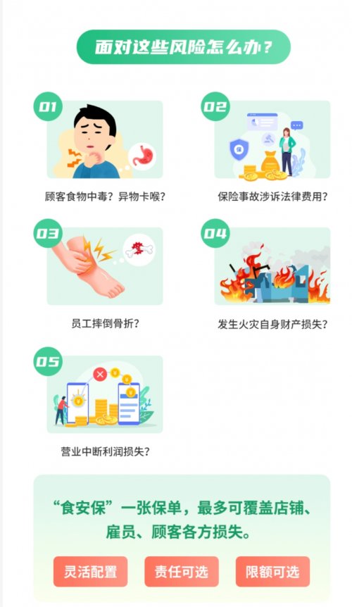 餐饮老板最怕啥?顾客食物中毒、异物卡喉的纠纷,员工摔骨折的赔偿,火灾烧了店铺的损失,甚至营业中断的利润亏空…… 这些 “经营雷点” 随便踩中一个都够闹心。这张图里的 5 类风险,恰恰是餐饮商家的日常焦虑,而 “食安保” 一张保单就能把店铺、雇员、顾客的损失都兜住,灵活配置的属性更是给足了选择权。