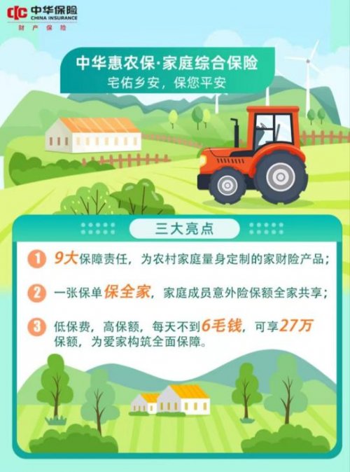 农村家庭的保障也不用愁!“中华惠农保・家庭综合险” 是专门量身订做的:9 大保障责任覆盖日常风险,一张保单保全家,保额还是全家共享的。最香的是成本 —— 每天不到 6 毛钱,就能享 27 万保额,不管是家里的财产还是家人的意外,都能被稳稳护住,“宅佑乡安” 是真的接地气。